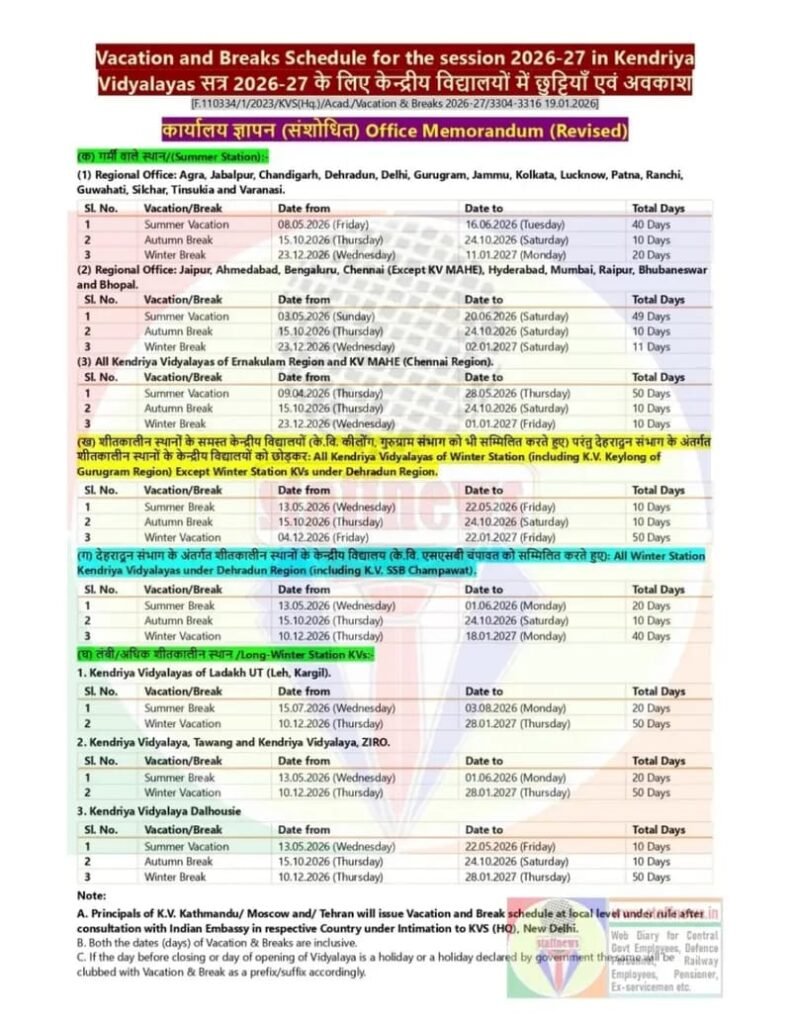 केवीएस की छुट्टियों का मौसम इलाके के हिसाब से यहां पर तय करता है। हर जगह का जो मौसम है वह एक जैसा बिल्कुल नहीं रहता। इसी वजह से स्कूलों के लिए एक ही तारीख की छुट्टियां नहीं यहां पर रखा जाता है। इस बार भी स्कूलों को अलग-अलग ग्रुप में बताते हुए छुट्टियां घोषित कर दिया गया है।